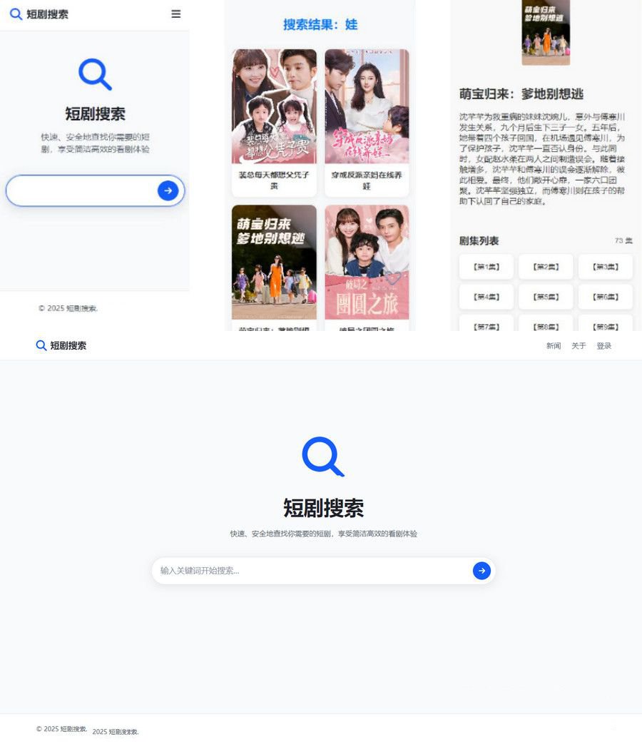 根據 AI 生成的在線短劇搜索支持在線播放源碼,簡單的在線短劇搜索和播放網站,由四個核心文件組成:index.html、search.php、list.php 和 play.php。它注重隱私保護,僅依賴瀏覽器歷史記錄,不保存任何服務器端或第三方的搜索記錄。