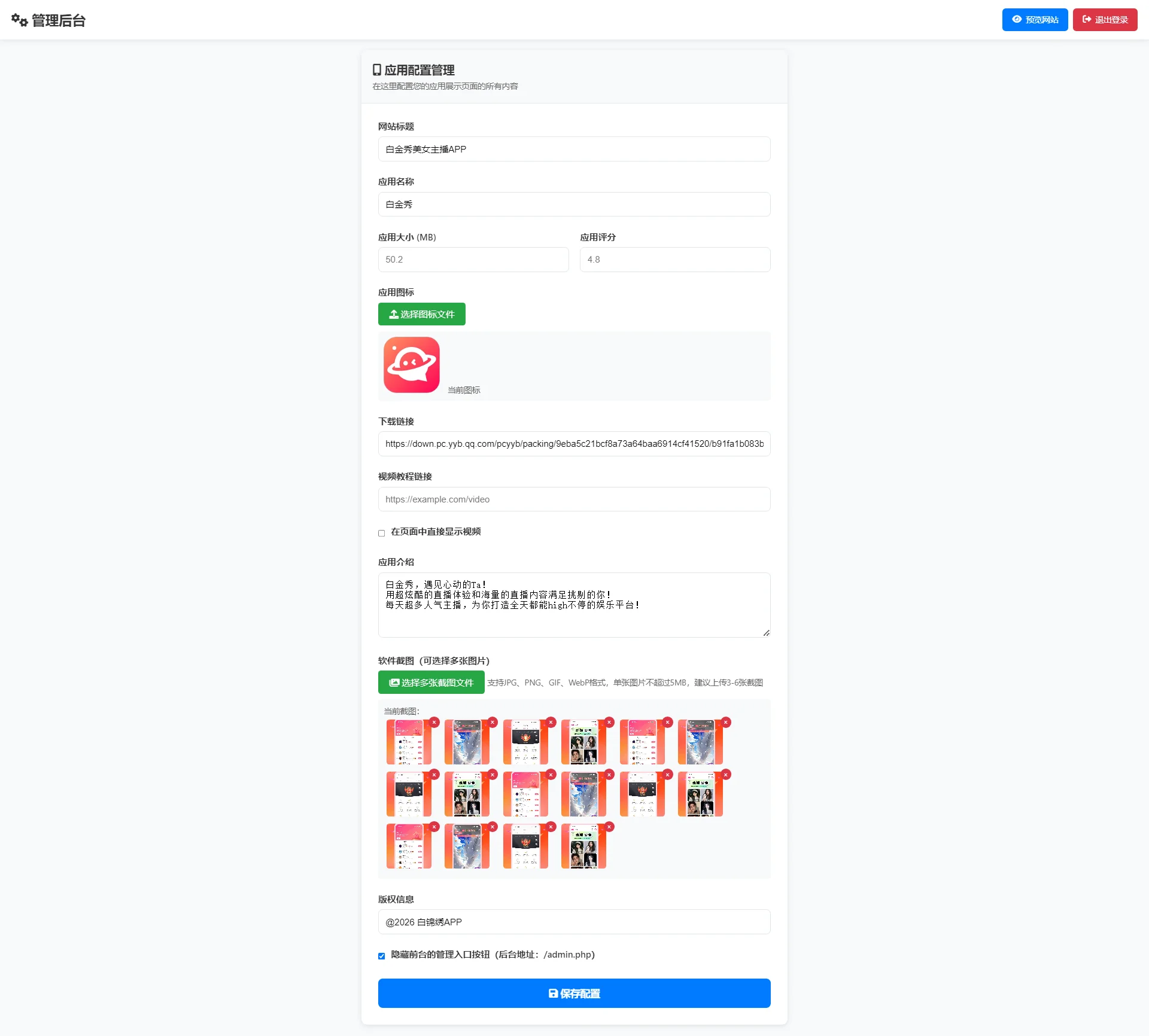 一款簡約好看的軟件下載頁,支持後臺管理功能。後臺訪問地址爲域名/admin.php,後臺賬號信息需自行配置。該軟件界面設計簡潔美觀,適合各類用戶使用。