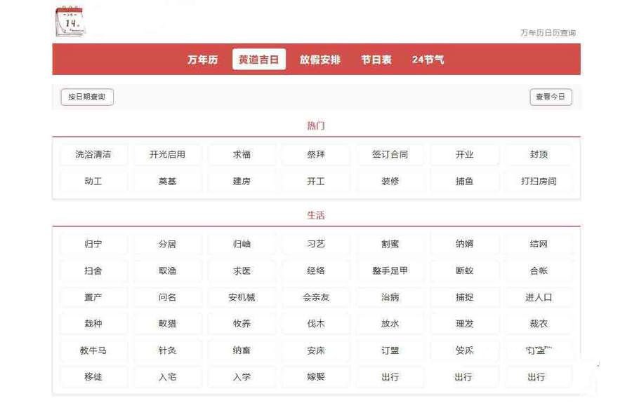 黃道吉日查詢 放假安排本源碼模板採用帝國cms7.5版UTF-8製作;適用站點:時間查詢、時差計算、萬年曆、黃道吉日查詢、假期查詢、節氣表等;源碼優勢:代碼精簡,利於SEO、UI大氣精簡,搜索引擎收錄高;全站僞靜態無需刷新生成,全站可緩存,訪問自動緩存,免維護;連接數量超過360萬;無需採集,自動更新,適合養站運營。