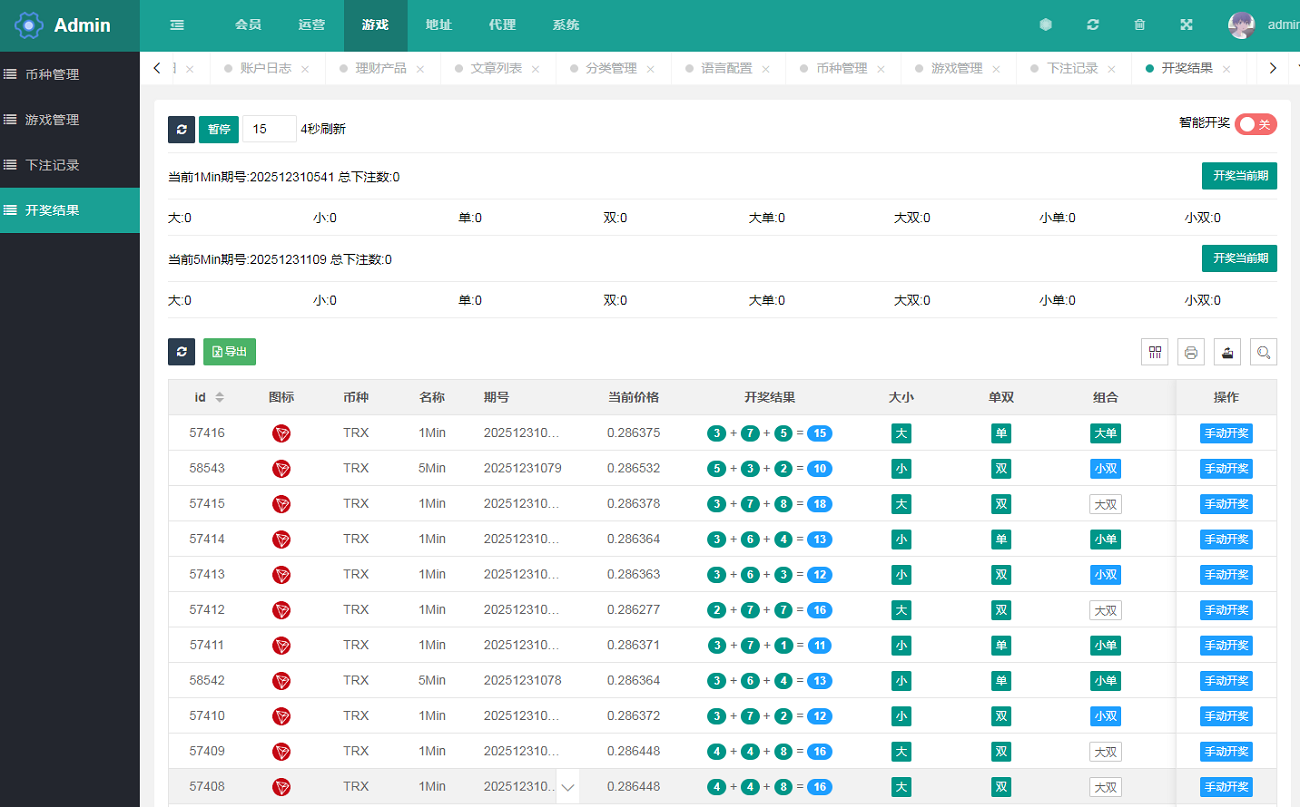 開獎界面K線正常,開獎方式支持手動、自動開獎