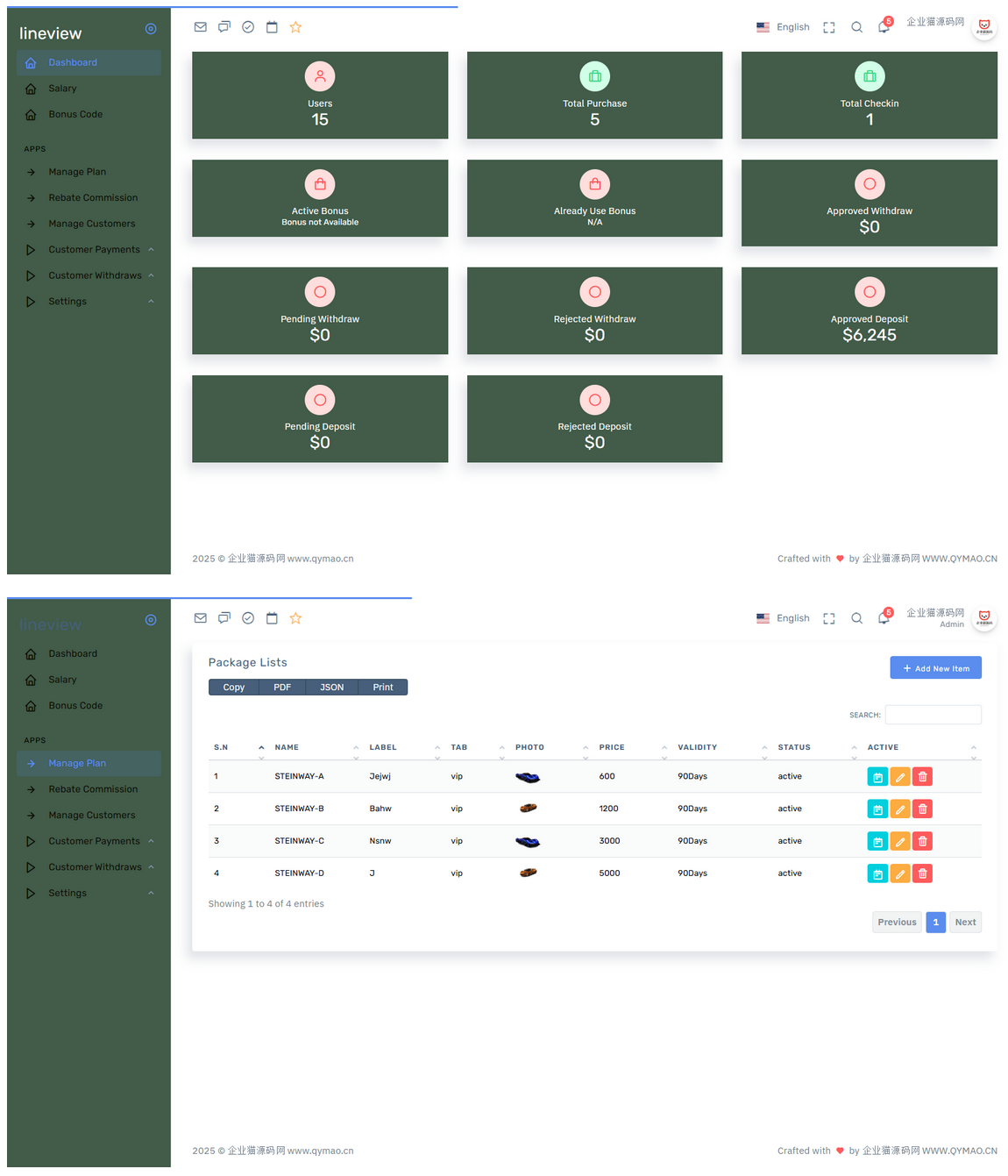 lineview海外汽車投資理財源碼/前端html+後端PHP和之前那些一樣的,都是可以任意套產品,不過前端UI還是挺好看的,看了下代碼應該是扒了uniapp的前端來二開的充值提現都是USDT,有3級分銷,後臺可以設置返利佣金比例
