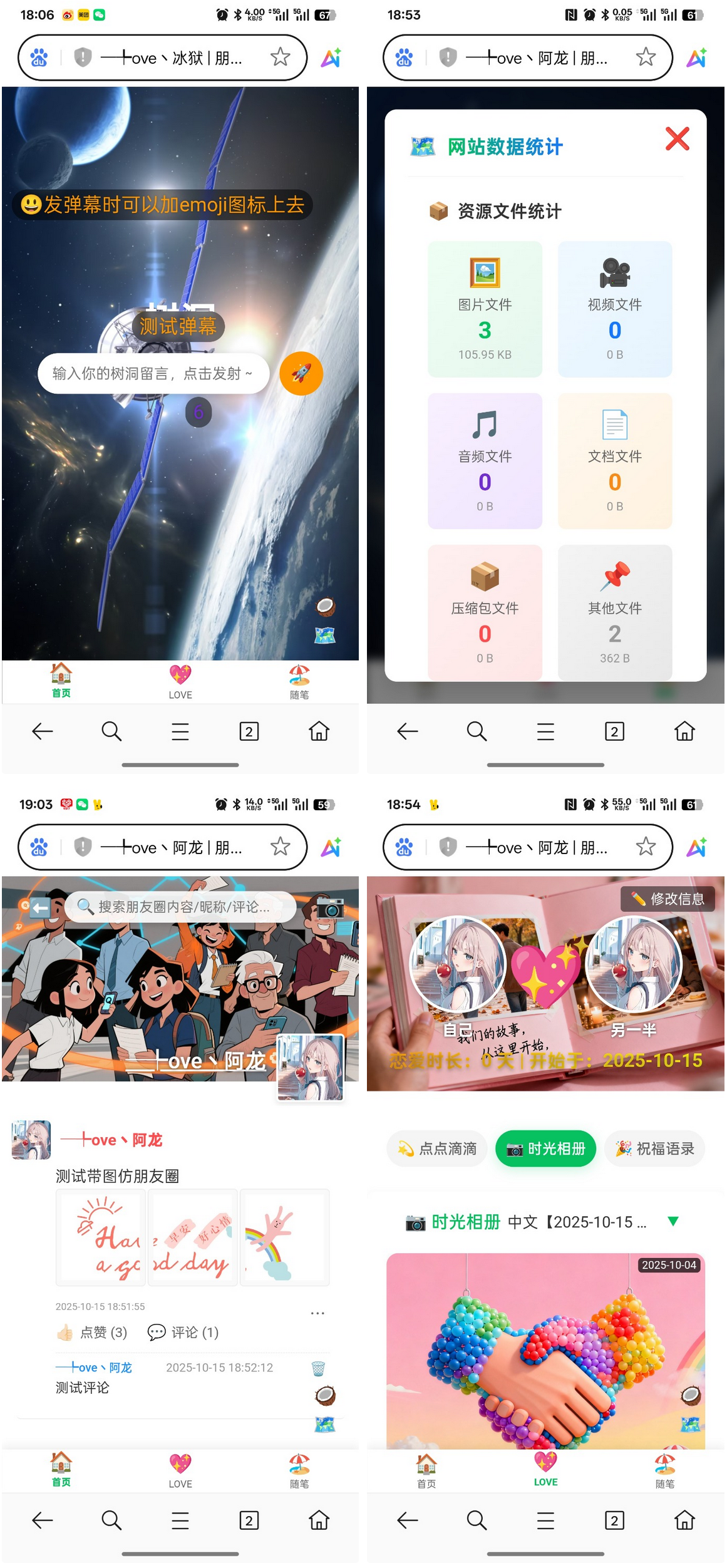 前兩天發的那個版本的更新版。增加了一下功能,完善隨筆頁面功能,任何人都可以添加隨筆加入樹洞彈幕,入口在右下角優化朋友圈列表佈局和時光相冊支持中文文件夾,朋友圈置頂功能,點贊時滿屏特效時光相冊使用說明,在Time_album文件夾裏面新建文件夾,data/Time_album/中文/然後裏面就是要放的時光相冊圖片,其它會自動獲取文件夾和圖片加入網站數據統計功能清理孤立文件功能,清理數據目錄沒有關聯的文件節省服務器空間消耗安裝教程:上傳即可使用,更新後,有時候會彈窗提示chart.js未能加載,可以自己在index.php把該代碼註釋掉chart.js是JavaScript 圖表庫(Chart.js),用來繪製餅圖、柱狀圖等。賬號:amdin密碼123456