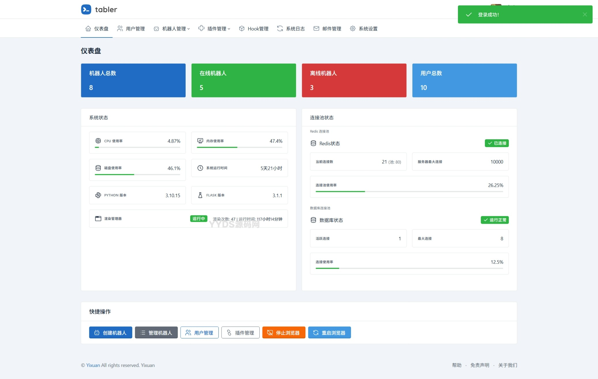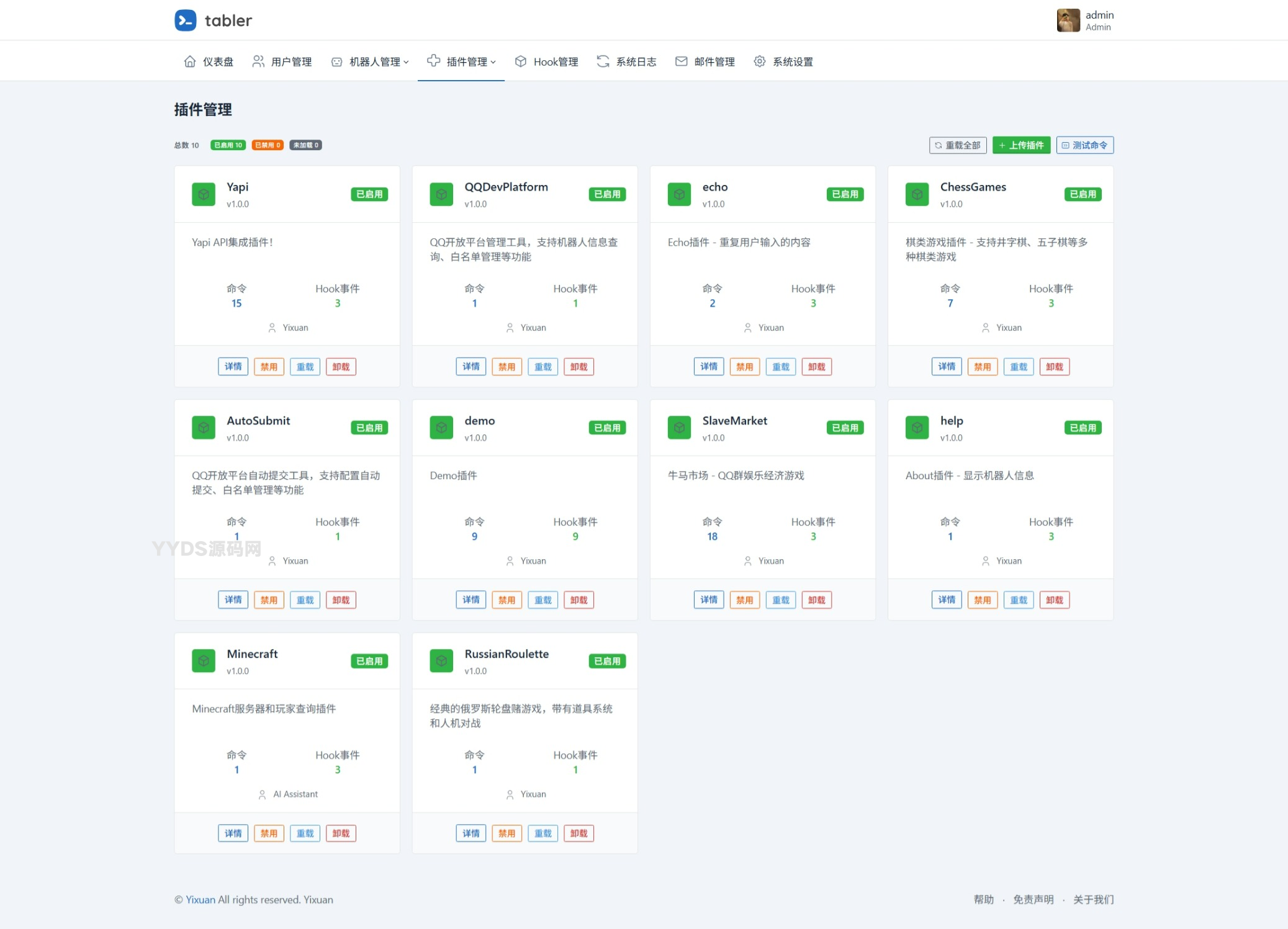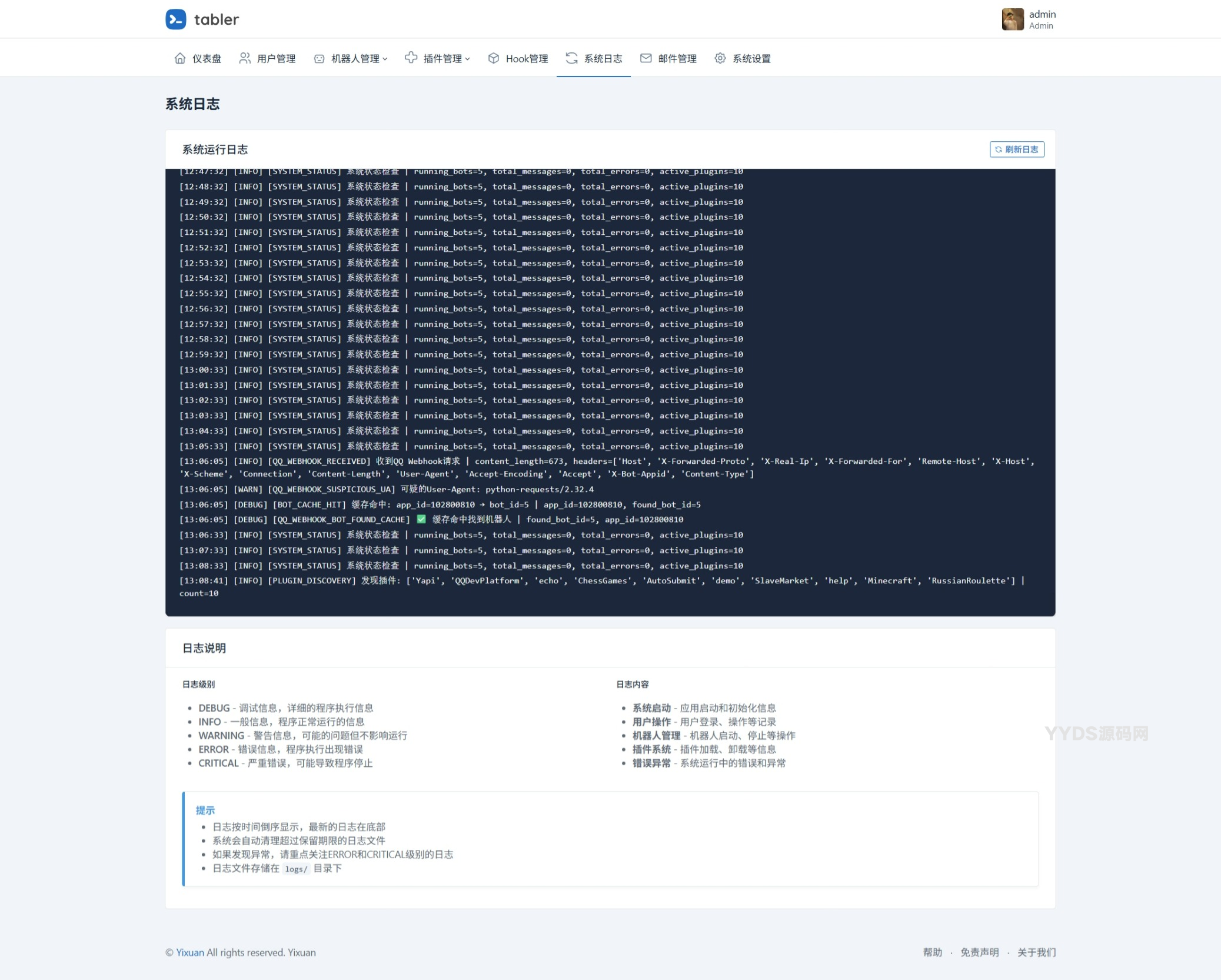 開箱即用的機qi人管理解決方案核心功能用戶認證系統 – 支持多用戶、角色權限管理多機qi人管理 – 統一管理多個QQ官方雞雞人Webhook事件處理 – 基於QQ官方Webhook API,穩定可靠實時狀態監控 – 機qi人運行狀態、消息統計、性能監控插件生態Hook驅動架構 – 靈活的事件鉤子系統熱插拔支持 – 無需重啓即可加載/卸載插件權限控制 – 用戶級和全局級插件權限管理豐富插件 – 內置echo、help等示例插件管理功能數據統計 – 消息量、用戶活躍度等統計分析日誌系統 – 分級日誌記錄,支持文件和Web查看配置管理 – 靈活的配置系統,支持環境變量郵件服務 – 集成郵件通知功能部署特性Python原生 – 純Python部署,跨平臺兼容高性能 – 基於Flask的高效Web框架生產就緒 – 支持多種WSGI服務器部署響應式UI – 基於Tabler框架的現代化界面