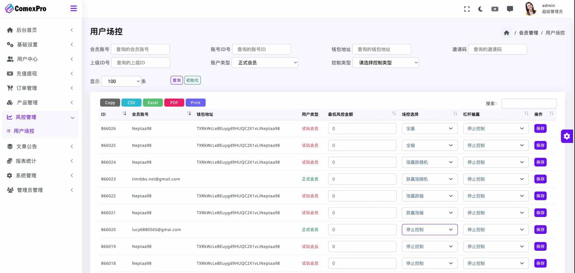 控制分爲用戶場控(全贏、全輸、漲贏跌隨機、跌贏漲隨機、漲贏跌輸、跌贏漲輸),槓桿交易也可以控輸贏