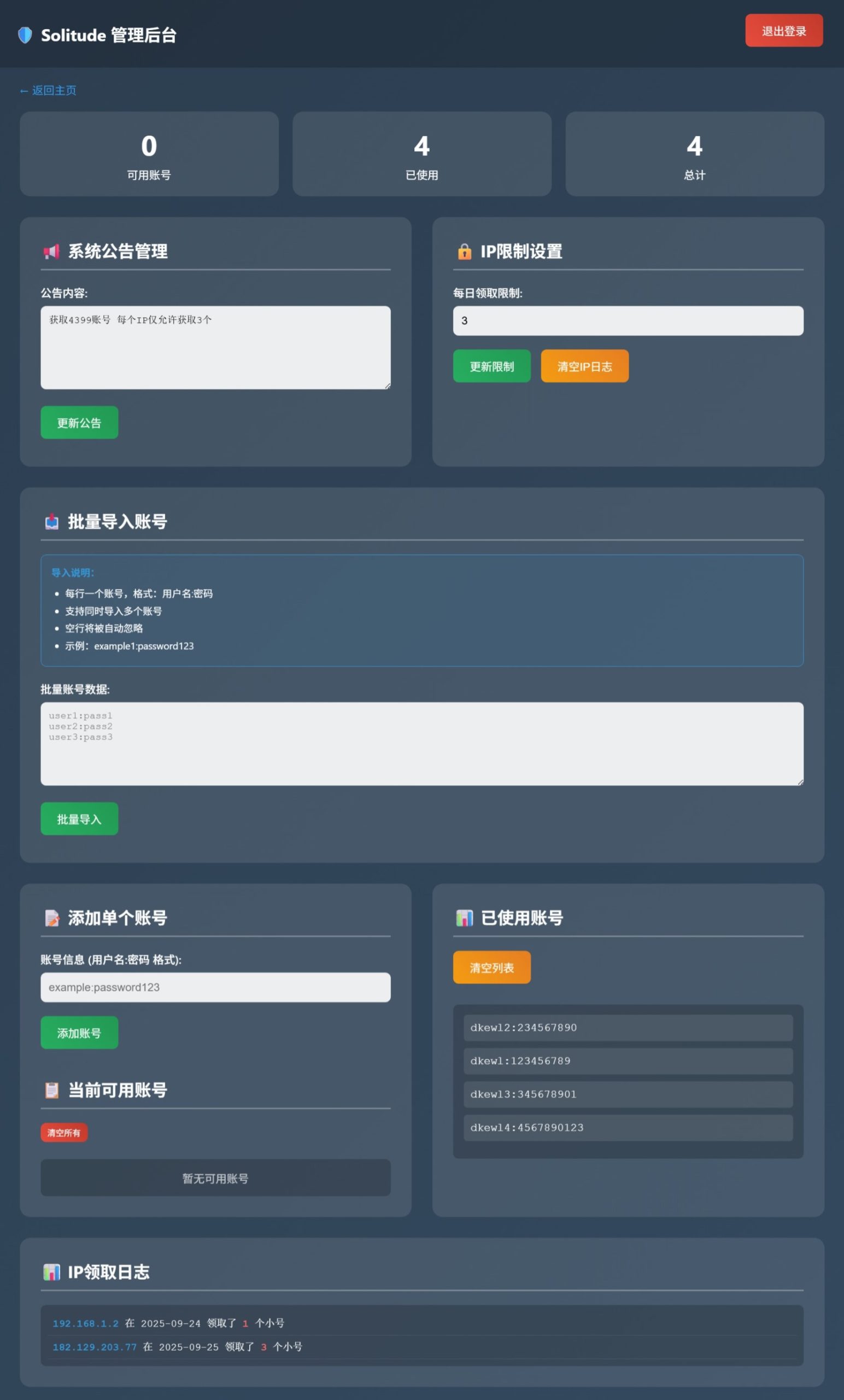 此爲小號分發卡密系統源碼,專用於分發小號庫存賬號或卡密等使用,不過規定每個IP僅能領取3次,也可視作小號分發工具。已做過簡易測試,感興趣者可自行部署使用!