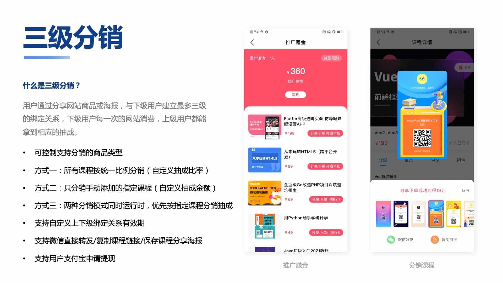 課程秒殺,團購,分銷裂變,多種組合營銷助你推廣引流;
